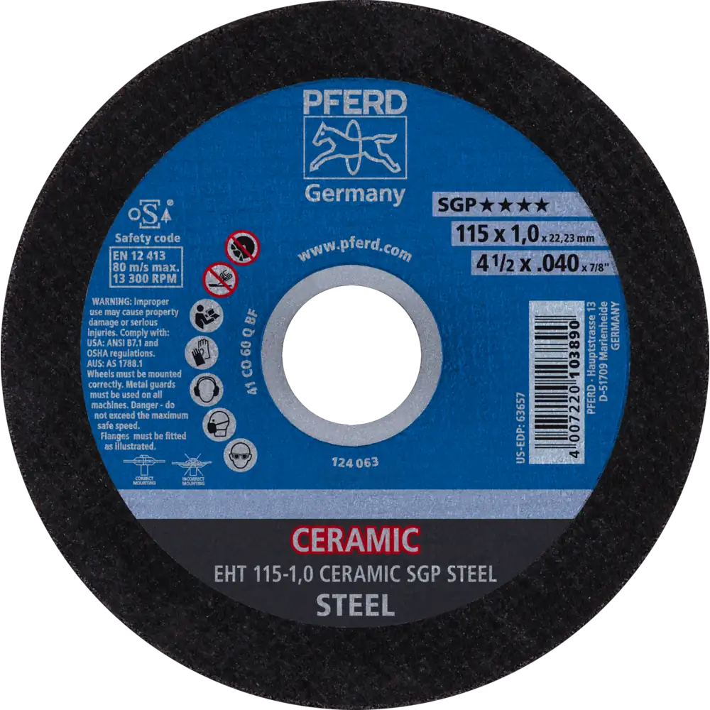 The EHT CERAMIC SGP STEEL cut-off wheel combines self-sharpening ceramic oxide grains with advanced bond technology to deliver unmatched cutting speed and tool life. Designed for steel, it excels at large cross sections while producing thin, burr-free cuts. Durable and efficient, it maximizes economic efficiency in demanding environments. Ideal for cutting profiles, solid materials, large sections, and holes, this wheel is a premium choice for industrial steel cutting.