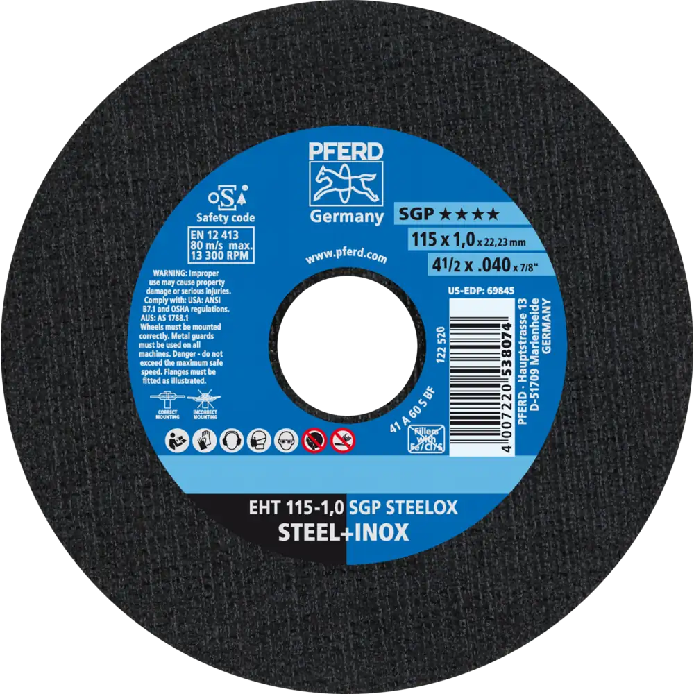 The EHT SGP STEELOX cut-off wheel is optimized for thin sheet metal and profiles, delivering clean, burr-free cuts with excellent tool life. Its wear-resistant bond ensures long-lasting performance and reduced wheel wear. Suitable for both steel and stainless steel, it ensures fast cutting and consistent results. Ideal for cutting thin sheet, profiles, and holes, this wheel offers outstanding performance and economic efficiency.