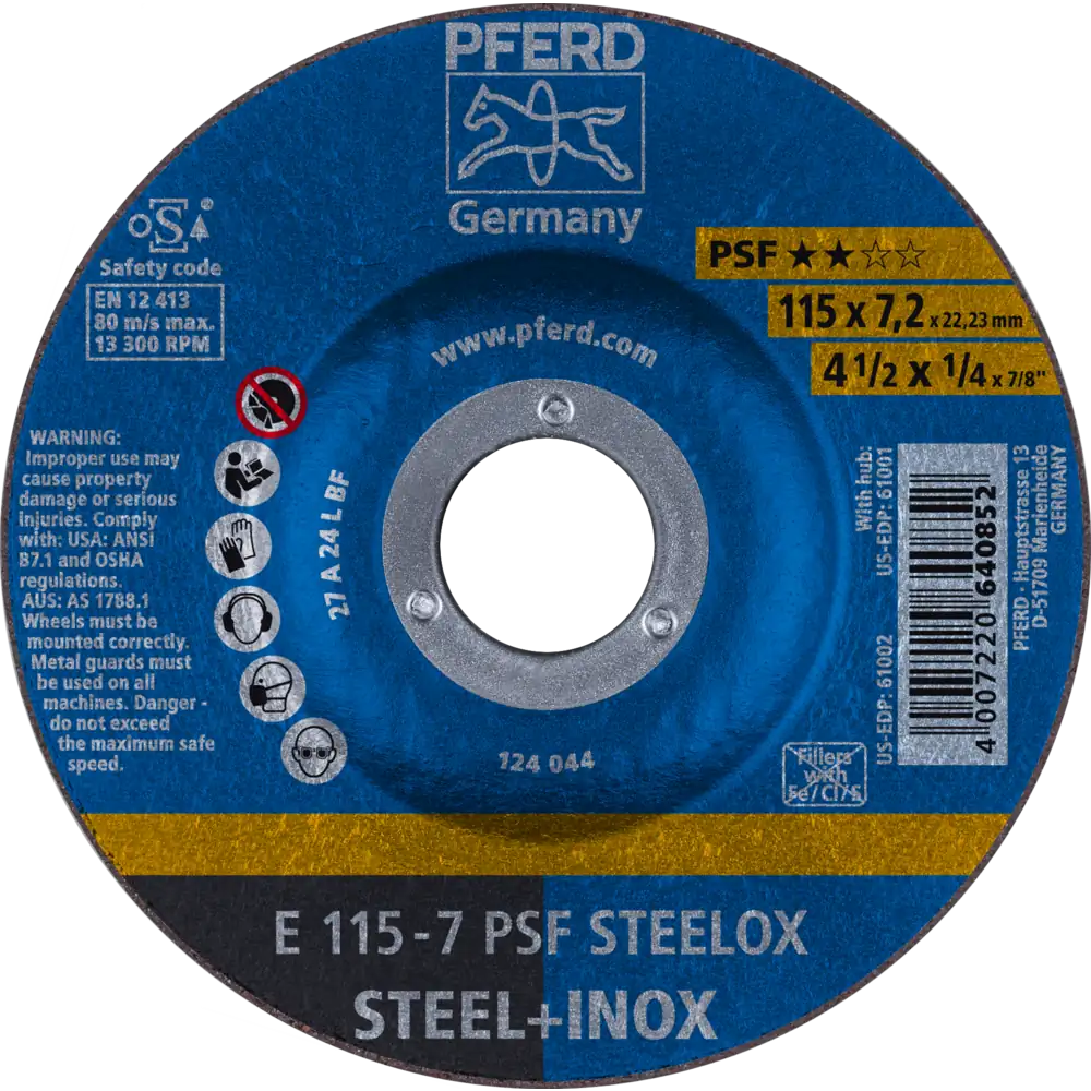The E PSF STEELOX grinding wheel provides dependable results on steel and stainless steel. Offering efficient material removal with a good service life, it is a versatile solution for everyday use. Its soft grinding characteristics make it effective even on low-power angle grinders while still achieving high stock removal. Ideal for chamfering, deburring, surface grinding, weld seam work, and fillet welds, this wheel combines consistent performance with economic efficiency.