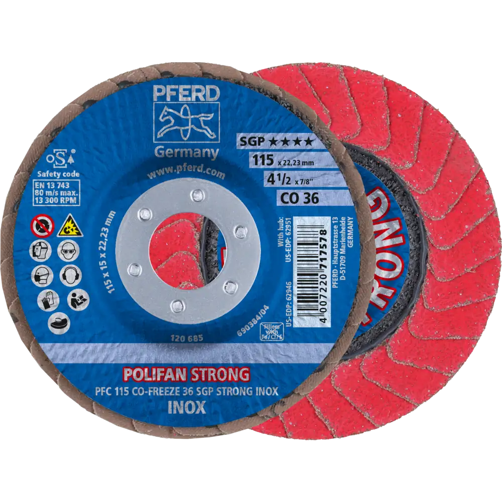 The PFC CO-FREEZE SGP STRONG INOX flap disc combines ceramic oxide grain with a unique FREEZE coating that minimizes heat build-up and sparks, even under challenging conditions. This makes it ideal for grinding stainless steel, cobalt alloys, and nickel- or titanium-based superalloys without risk of discoloration or thermal damage. With its STRONG flap design, it delivers unmatched stock removal and an exceptionally long service life. Perfect for fine grinding, surface preparation, and weld seam finishing, it sets a new standard in performance and efficiency.
