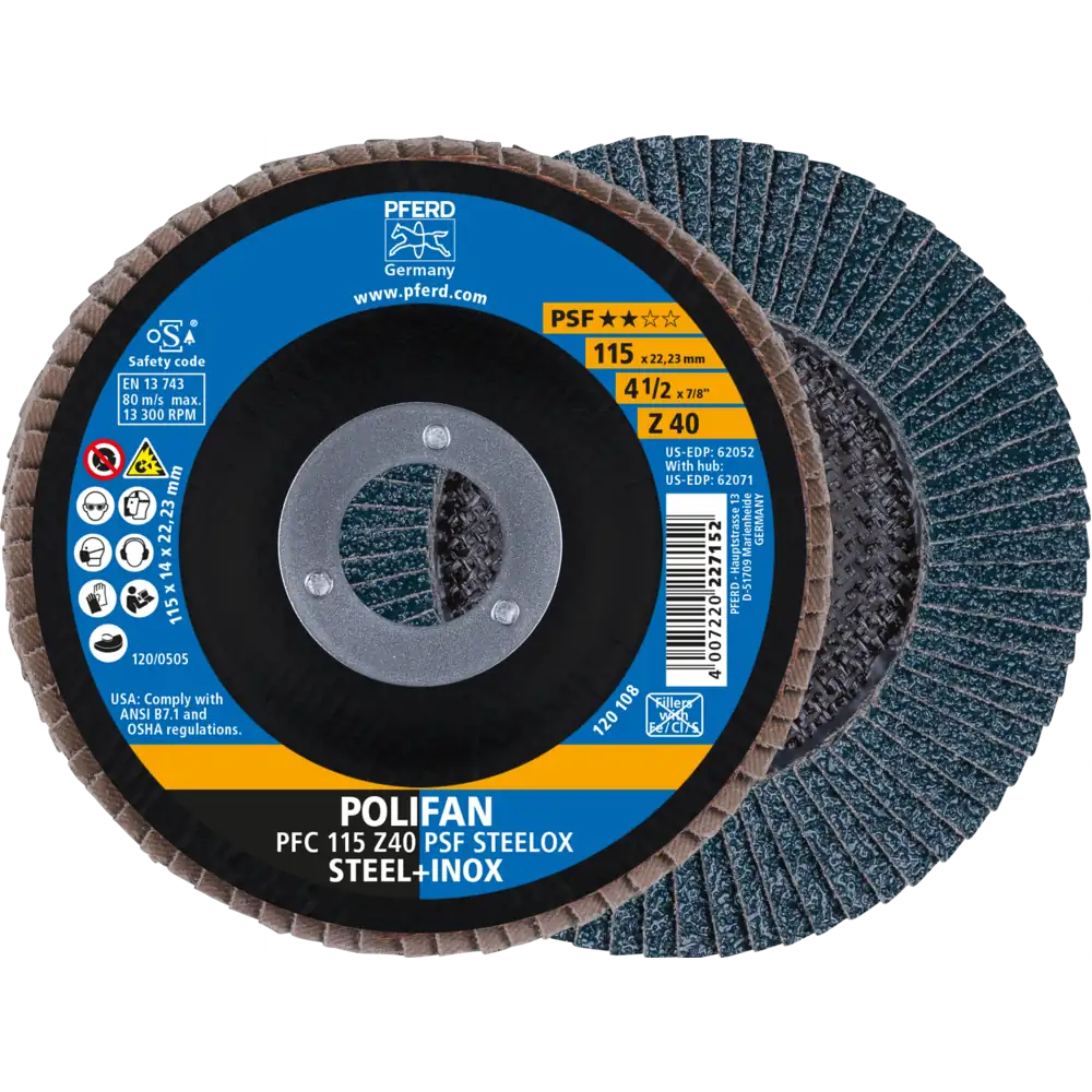 The PFC Z PSF STEELOX flap disc provides an economical solution for grinding steel and stainless steel. Its aggressive abrasive action ensures fast stock removal, while a durable design extends tool life. Suitable for use even with lower-power grinders, it is versatile across a wide range of tasks. Ideal for chamfering, deburring, surface grinding, step-by-step fine grinding, and weld seam finishing, it balances performance and cost-effectiveness.