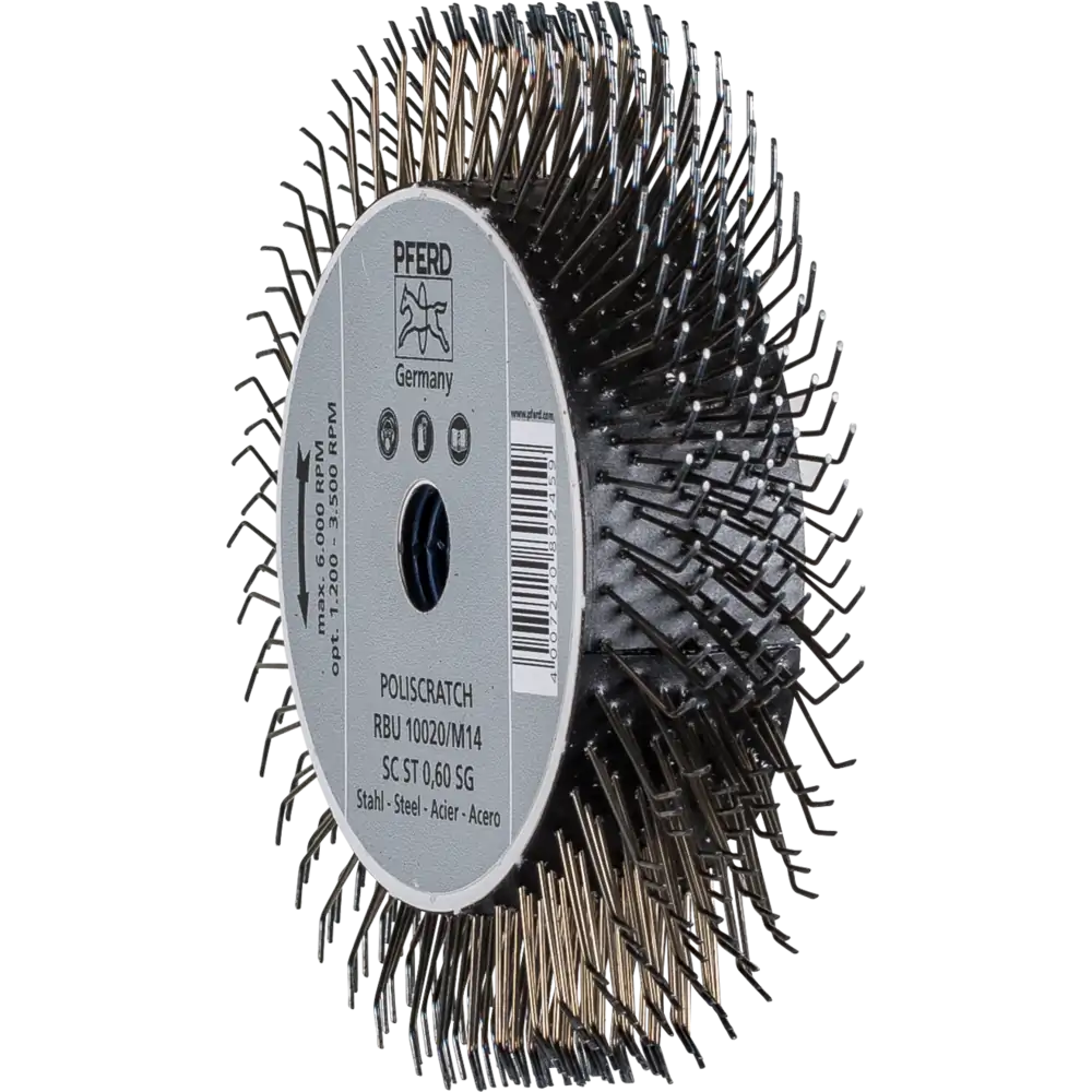 The PFERD POLISCRATCH RBU Crimped Wheel Brush provides cool, efficient cleaning and finishing on steel and non-ferrous metals. With resharpenable wire and smooth operation, it offers long-lasting, professional performance for angle grinder applications